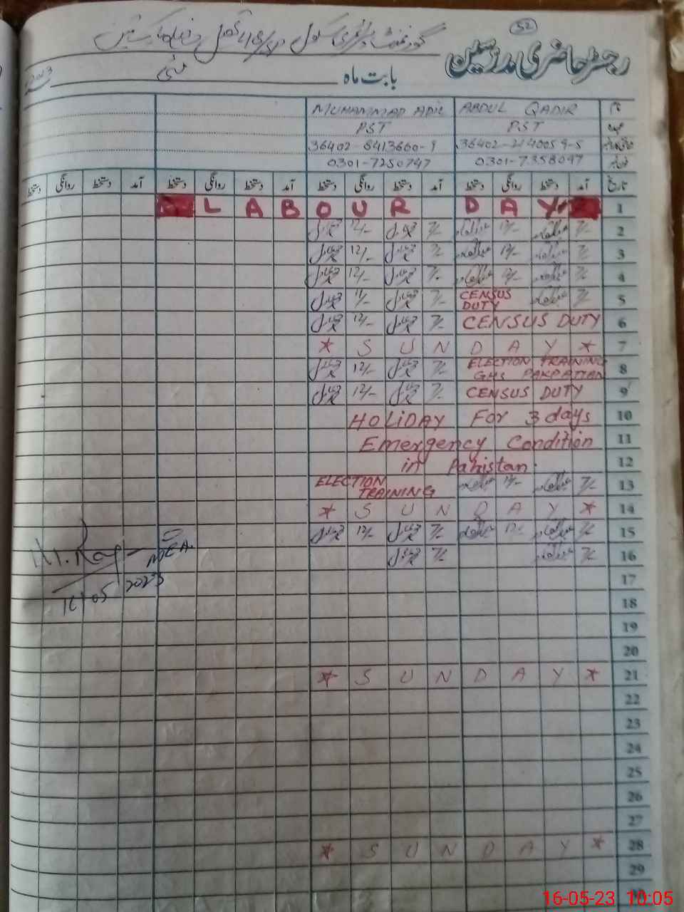 | CNIC | Full Name | Designation | R/C | Absence During Last Calender Month |