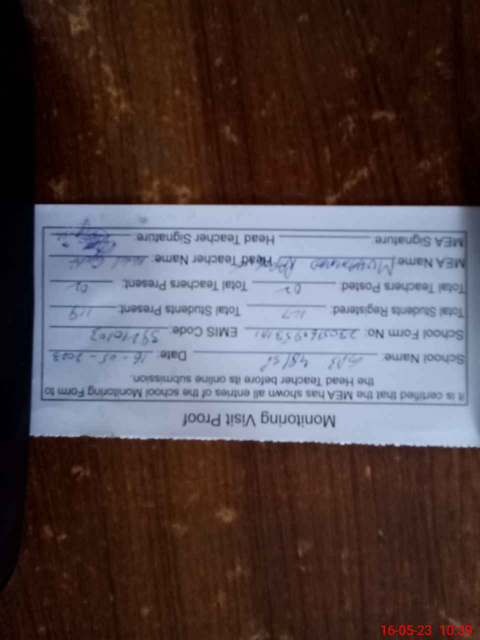 | Attendance Register | Head Teacher | MEA with School | Visit Proof |