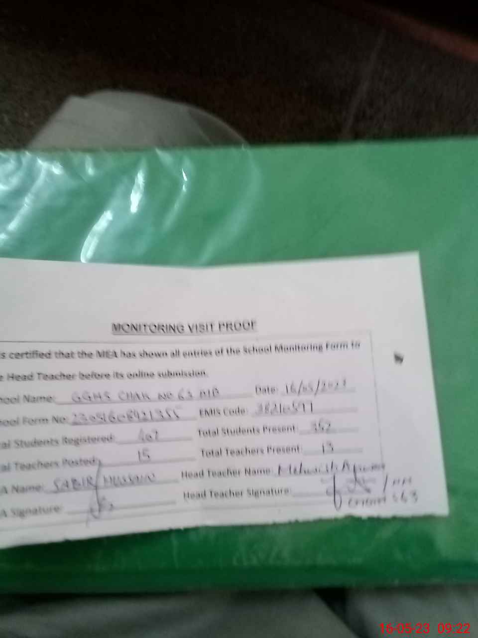 | Attendance Register | Head Teacher | MEA with School | Visit Proof |