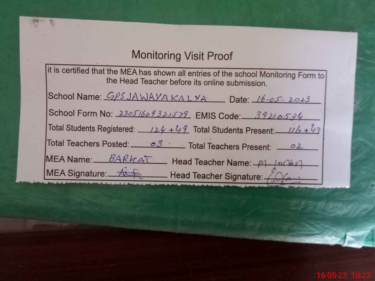 | Attendance Register | Head Teacher | MEA with School | Visit Proof |