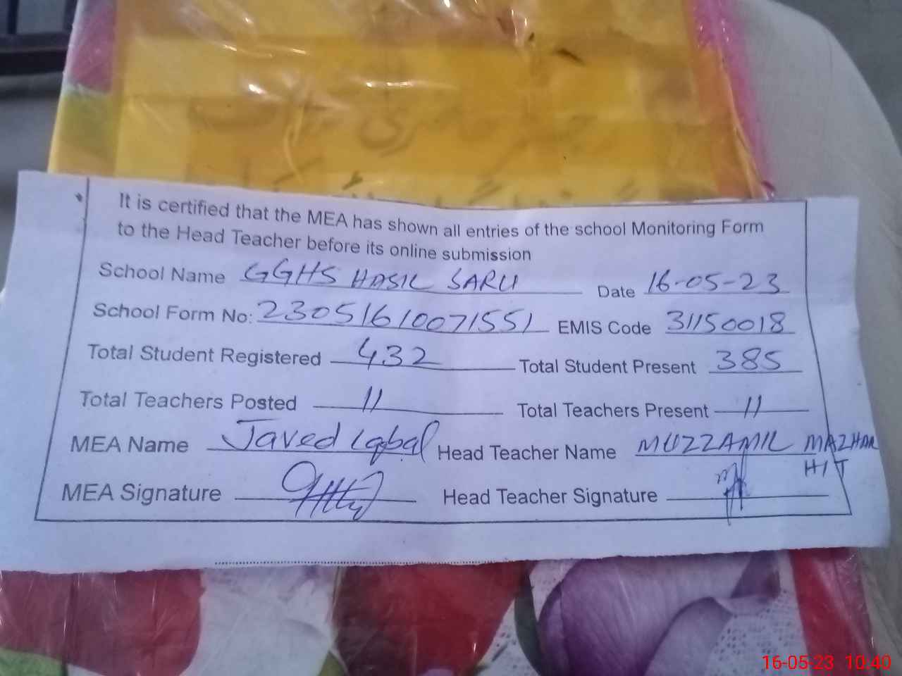 | Name: MU**** MA**** Designation: (School Headmaster's/Headmistress's) SST Phone/Cell Number: 03**** |