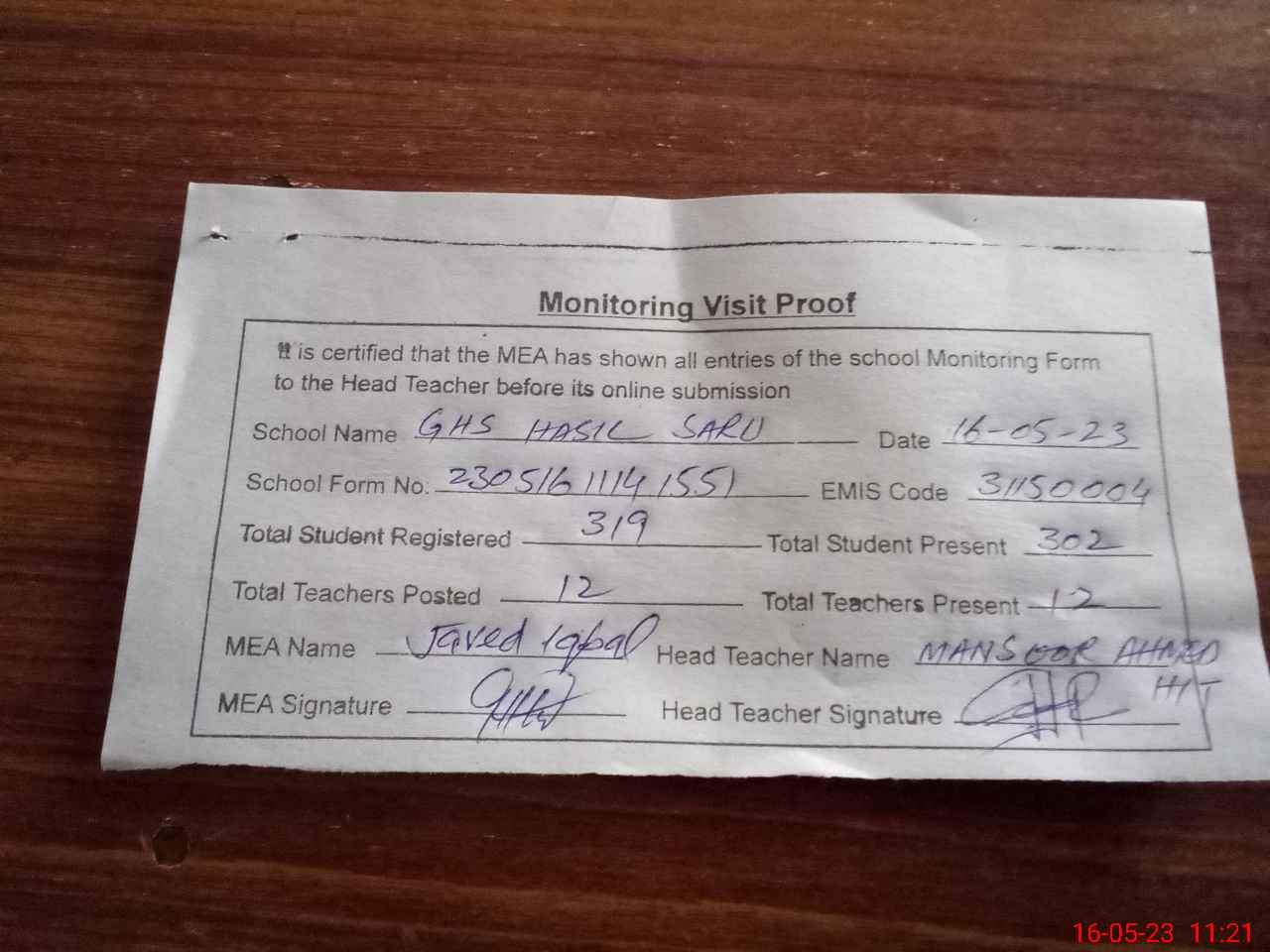 | Attendance Register | Head Teacher | MEA with School | Visit Proof |