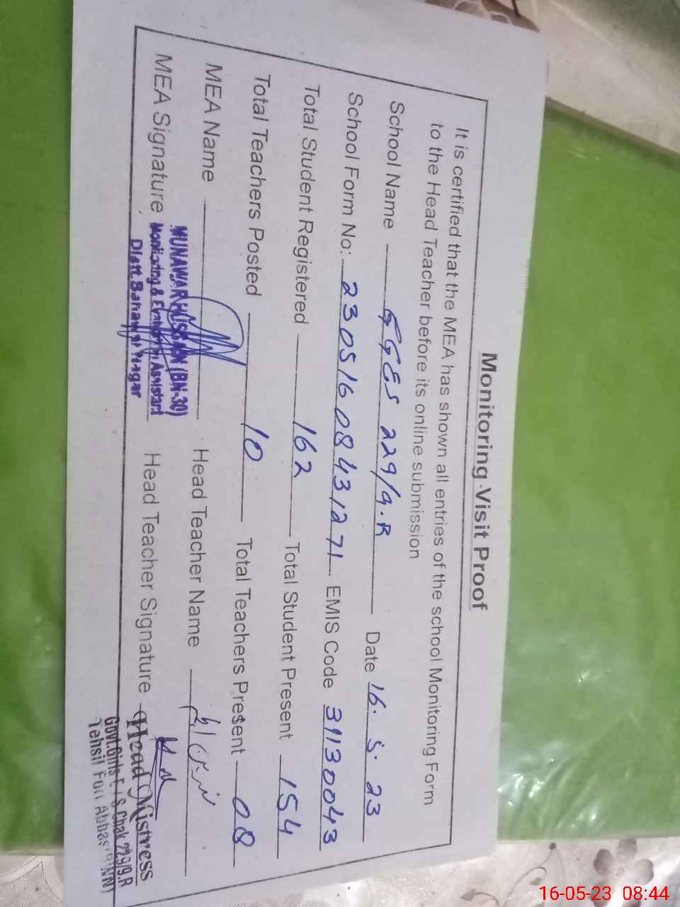 | Attendance Register | Head Teacher | MEA with School | Visit Proof |