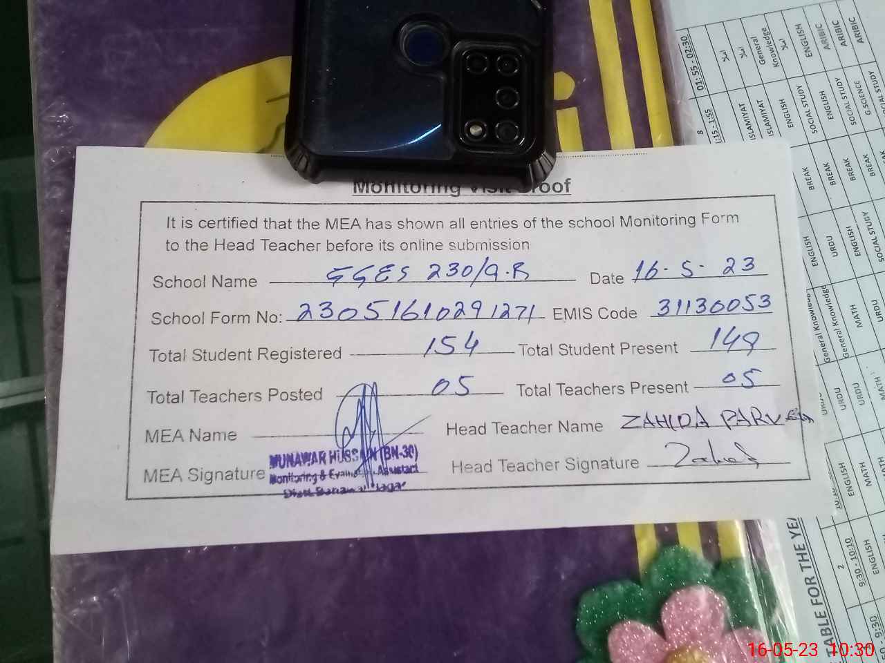 | Attendance Register | Head Teacher | MEA with School | Visit Proof |