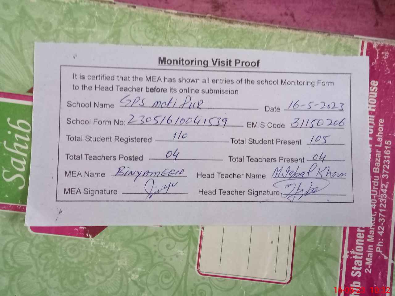 | EMIS Code: 31150206 | Name of School: GPS MOTI PUR | |||