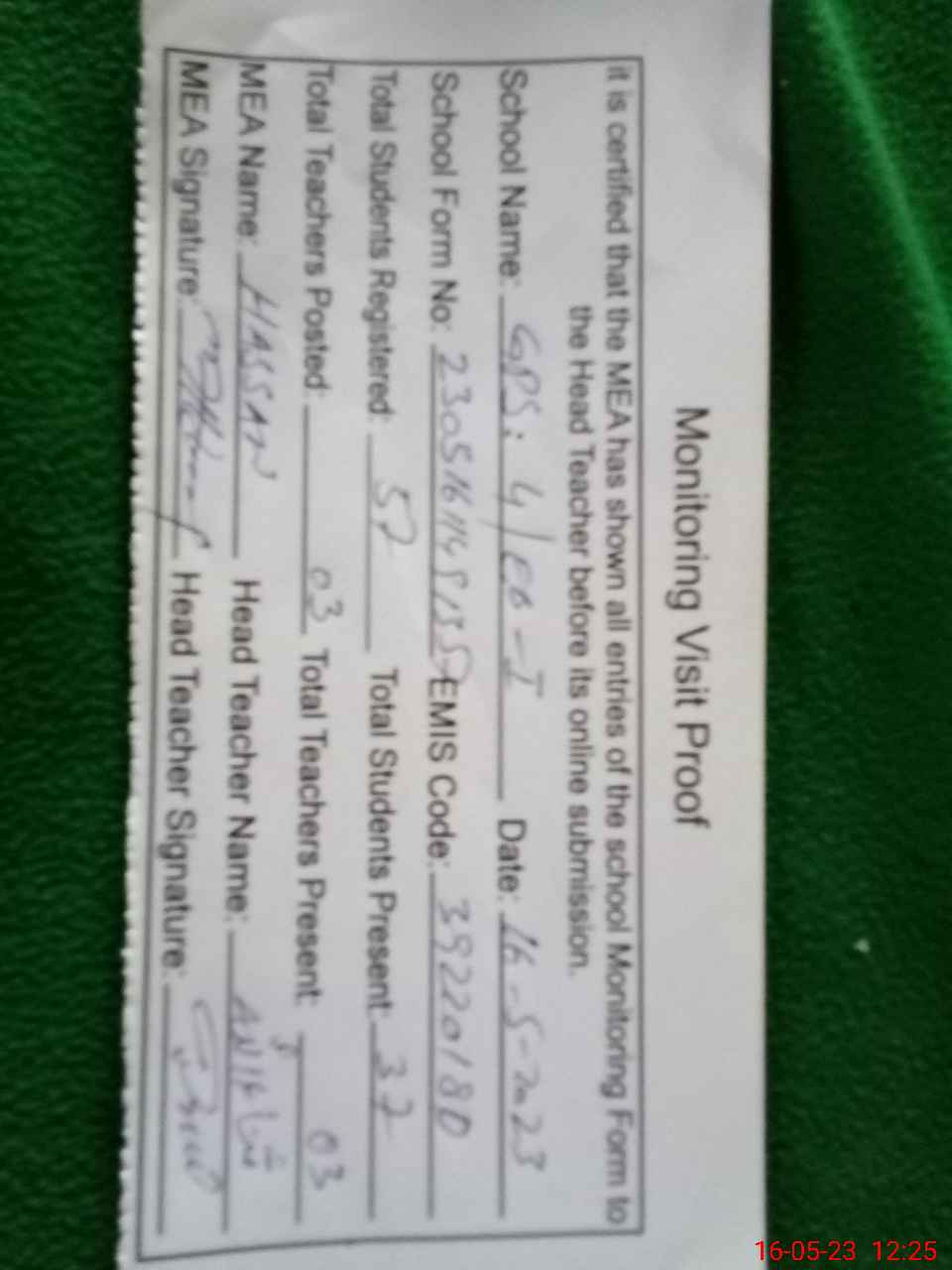 | Attendance Register | Head Teacher | MEA with School | Visit Proof |