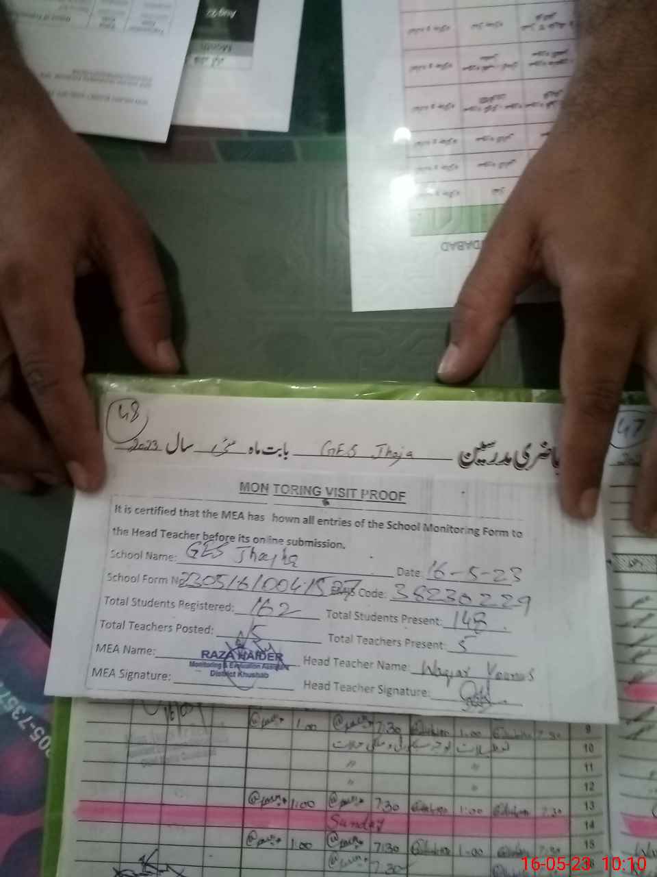 | Attendance Register | Head Teacher | MEA with School | Visit Proof |