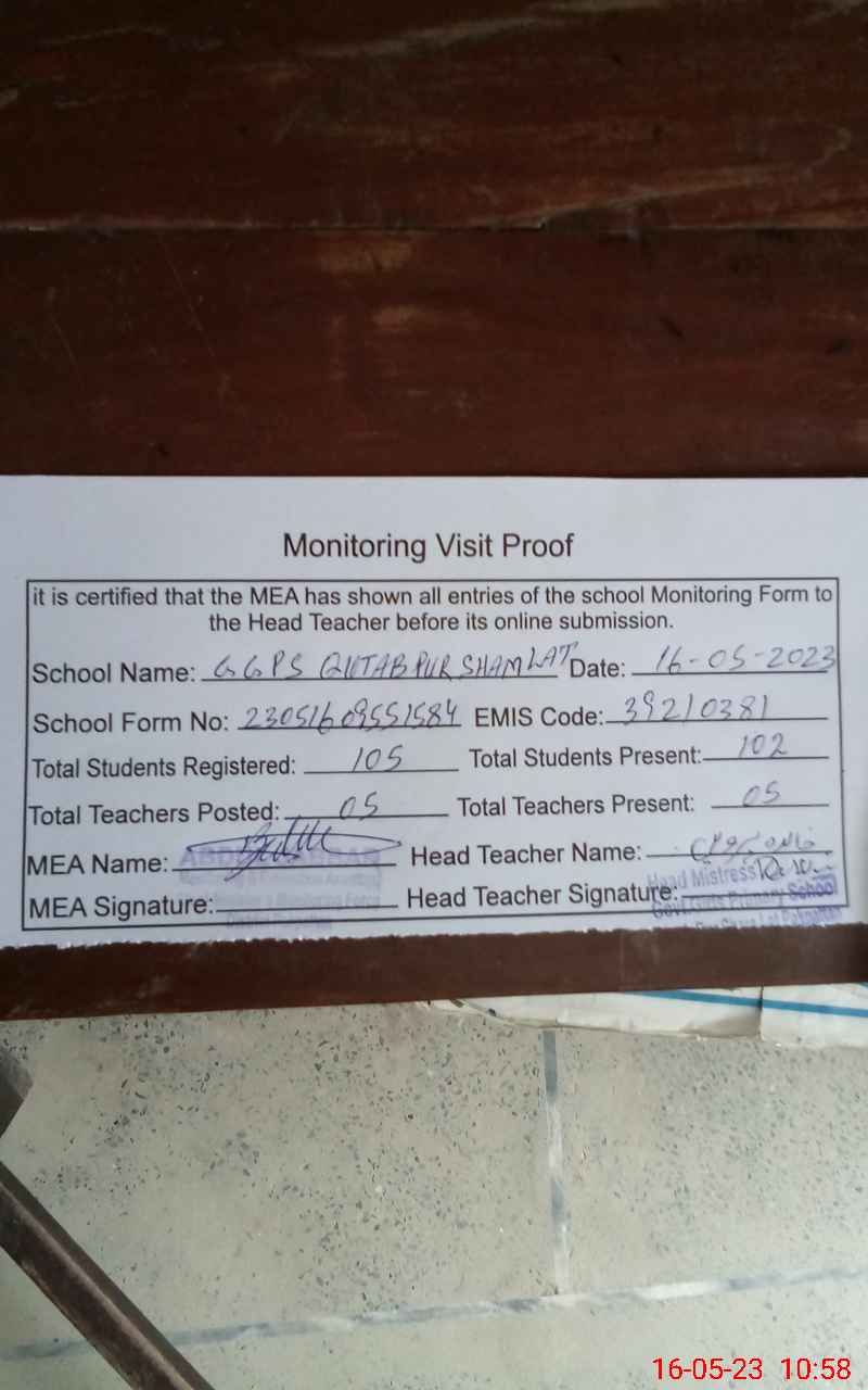 | EMIS Code: 39210381 | Name of School: GGPS QUTAB PUR SHAM LAT | |||