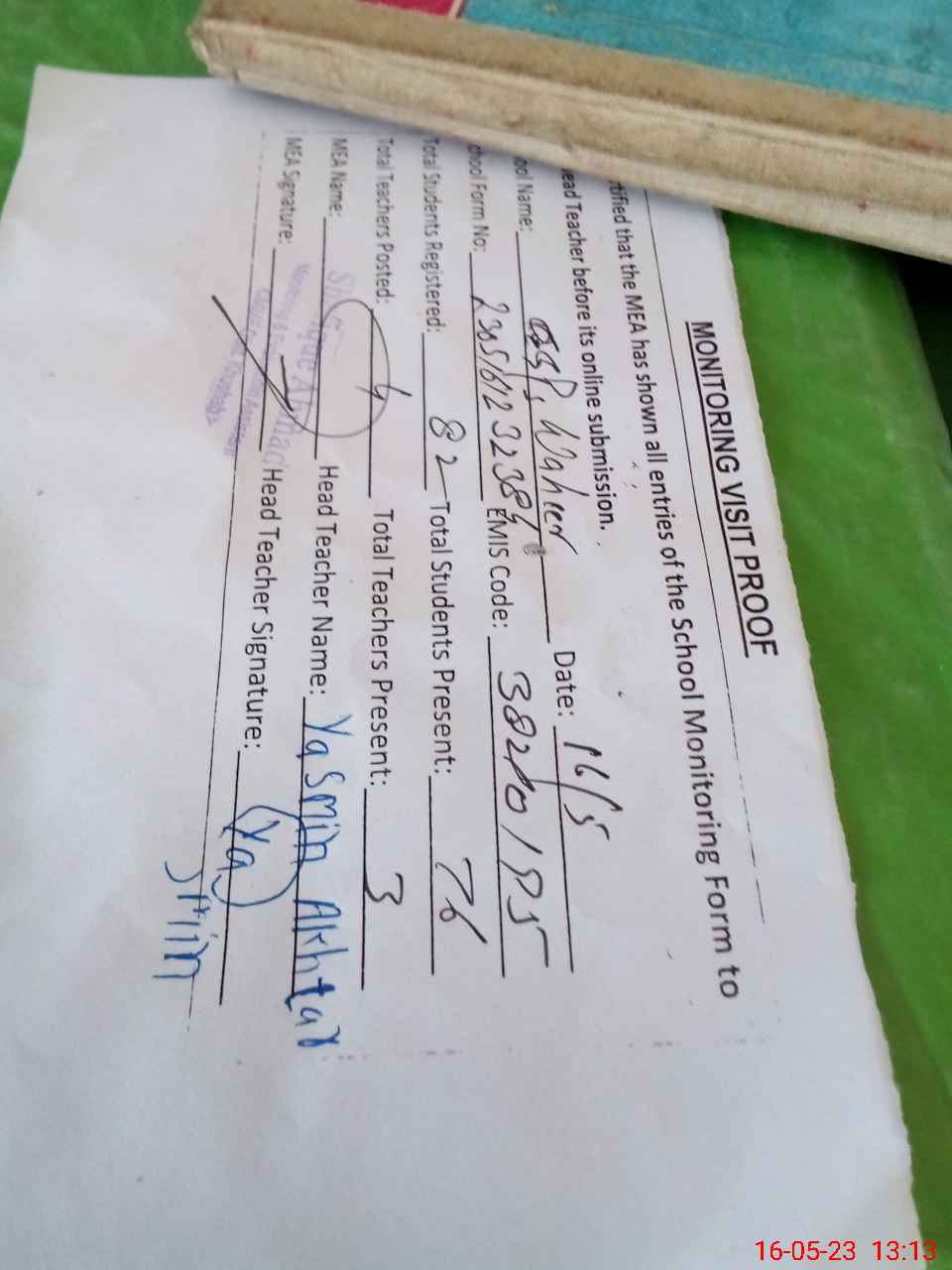 | Attendance Register | Head Teacher | MEA with School | Visit Proof |