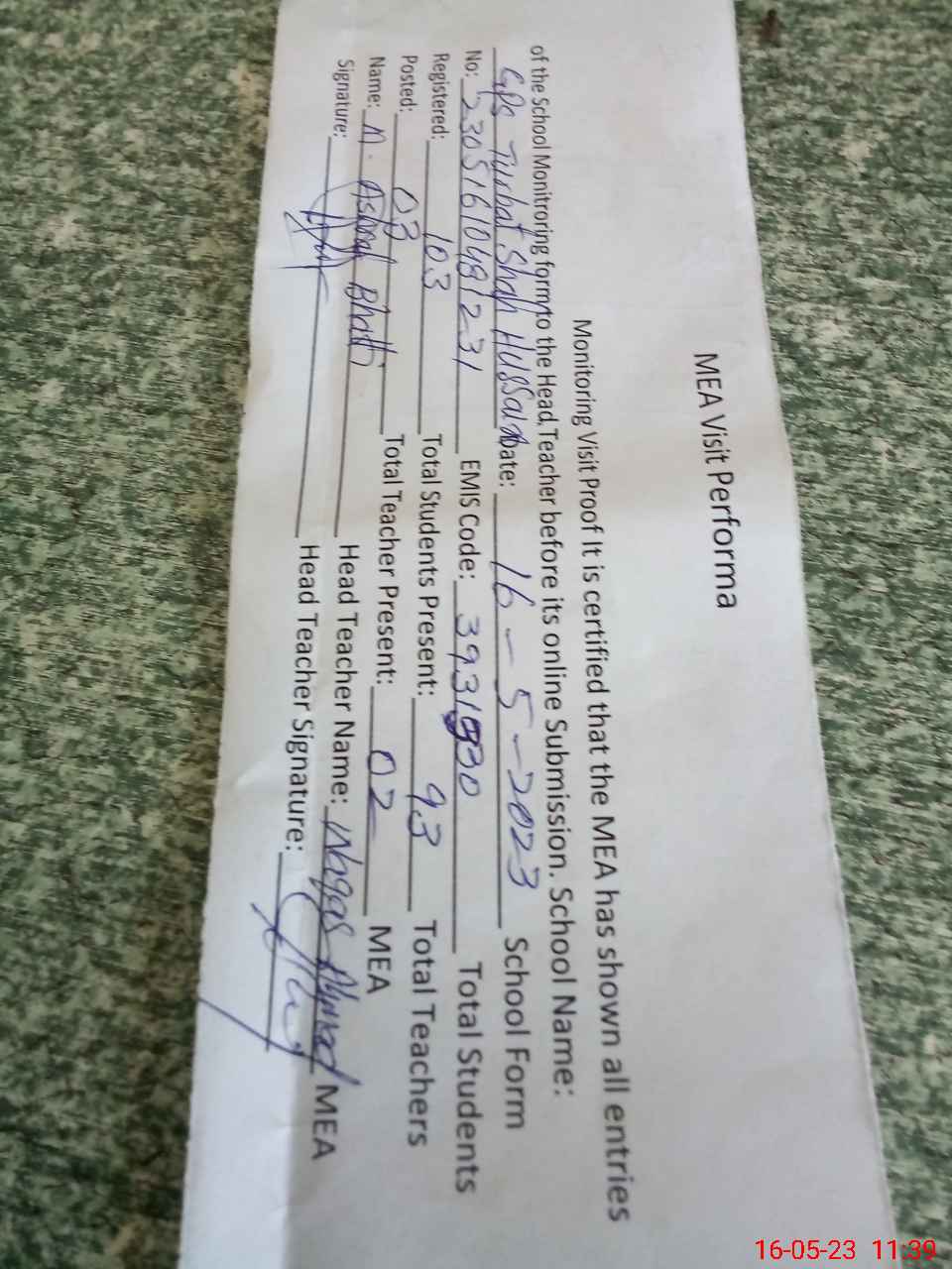 | Attendance Register | Head Teacher | MEA with School | Visit Proof |