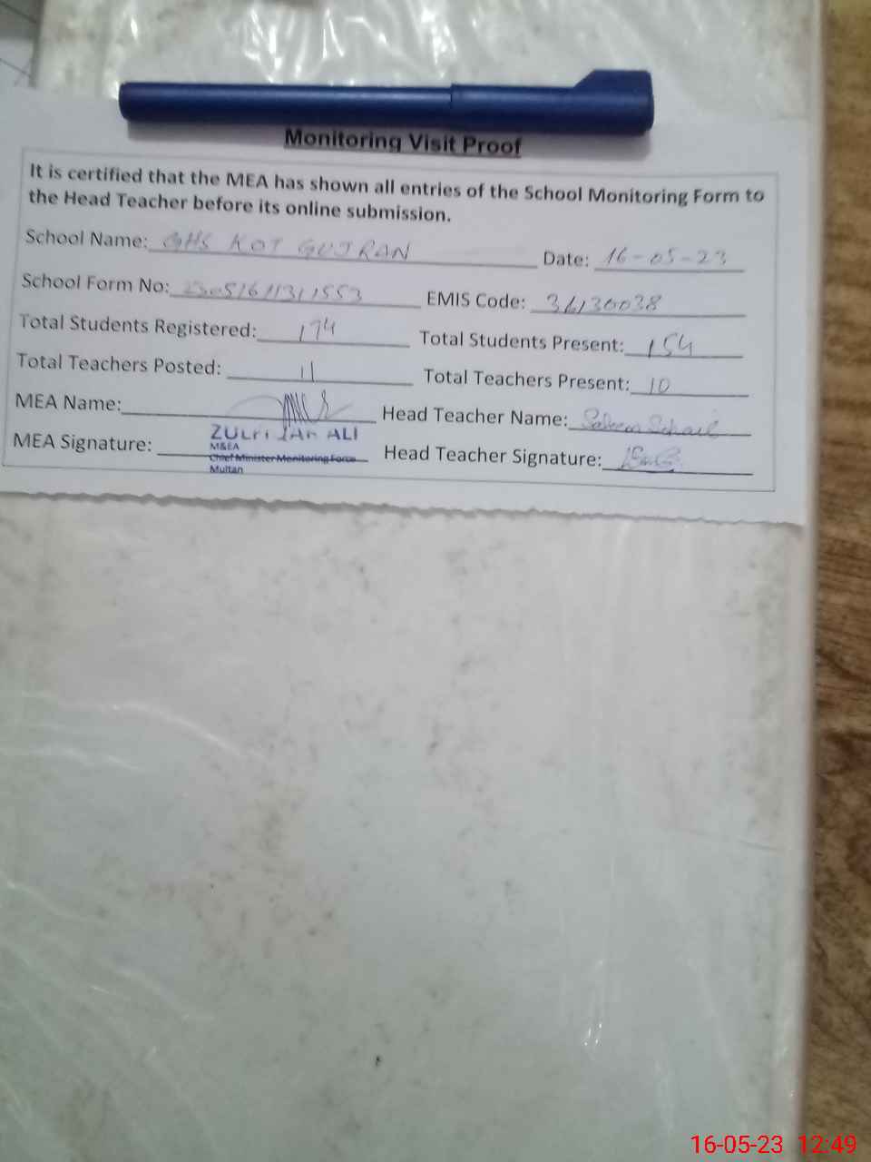 | EMIS Code: 36130038 | Name of School: GHS KOT GUJRAN MULTAN | |||
