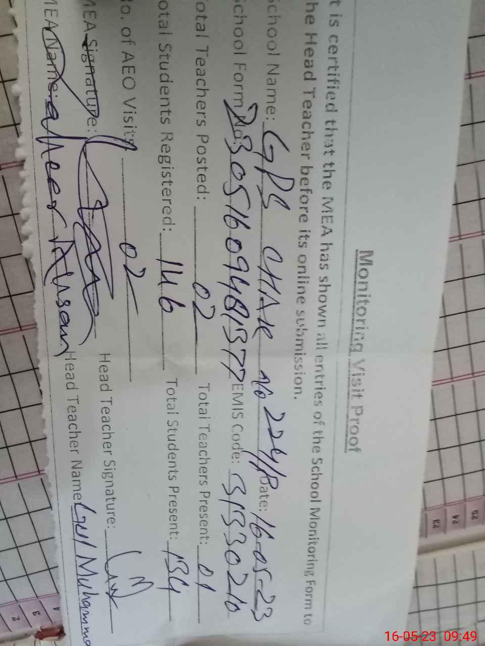 | Attendance Register | Head Teacher | MEA with School | Visit Proof |