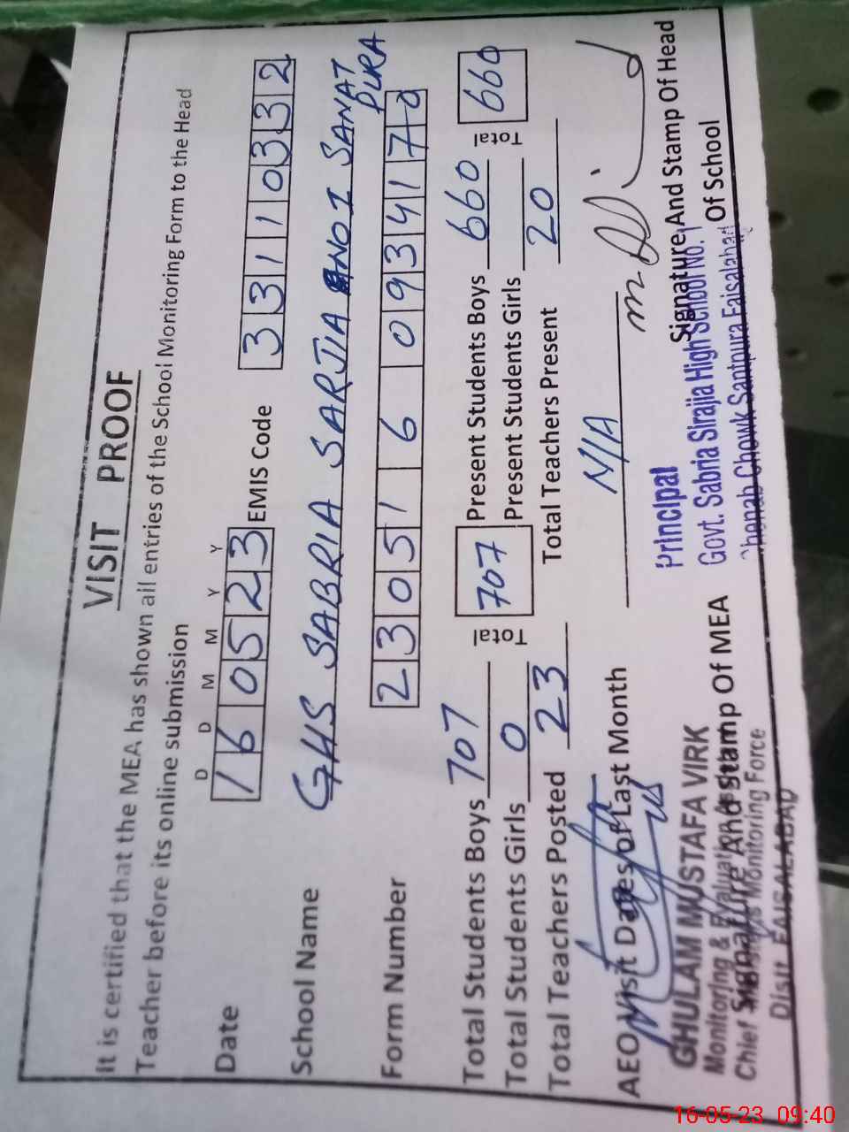 | EMIS Code: 33110332 | Name of School: GHS SABRIA SARJIA NO. 1 SANAT PURA FSD | |||