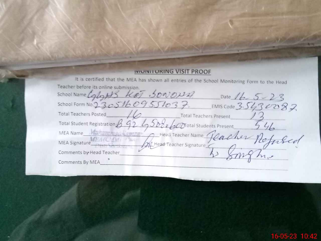 | Attendance Register | Head Teacher | MEA with School | Visit Proof |