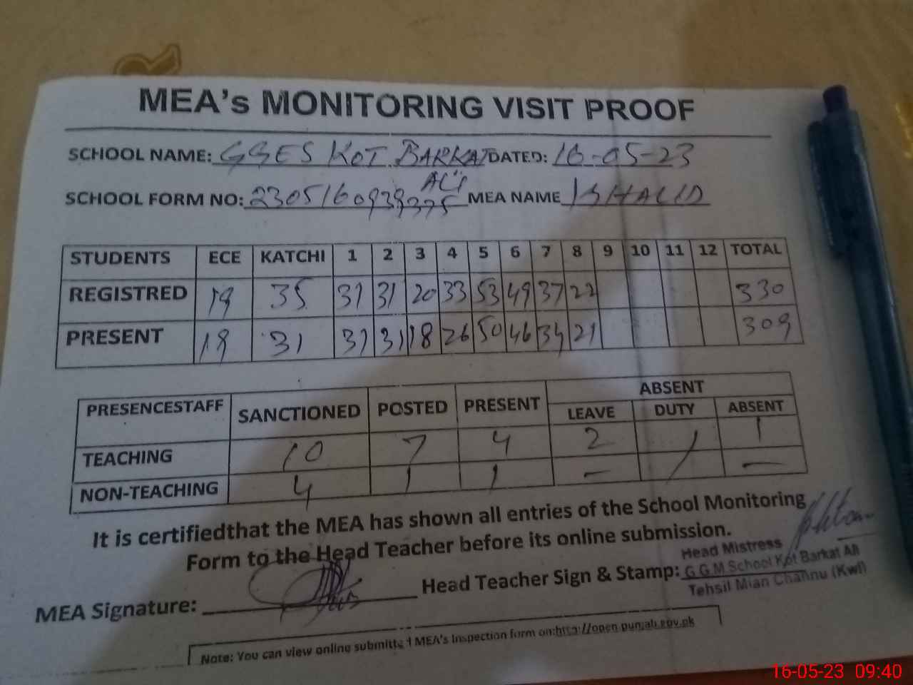 | Attendance Register | Head Teacher | MEA with School | Visit Proof |