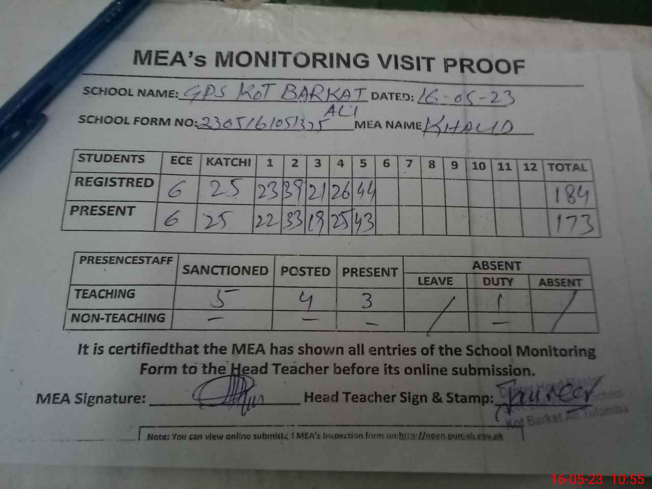 | Attendance Register | Head Teacher | MEA with School | Visit Proof |