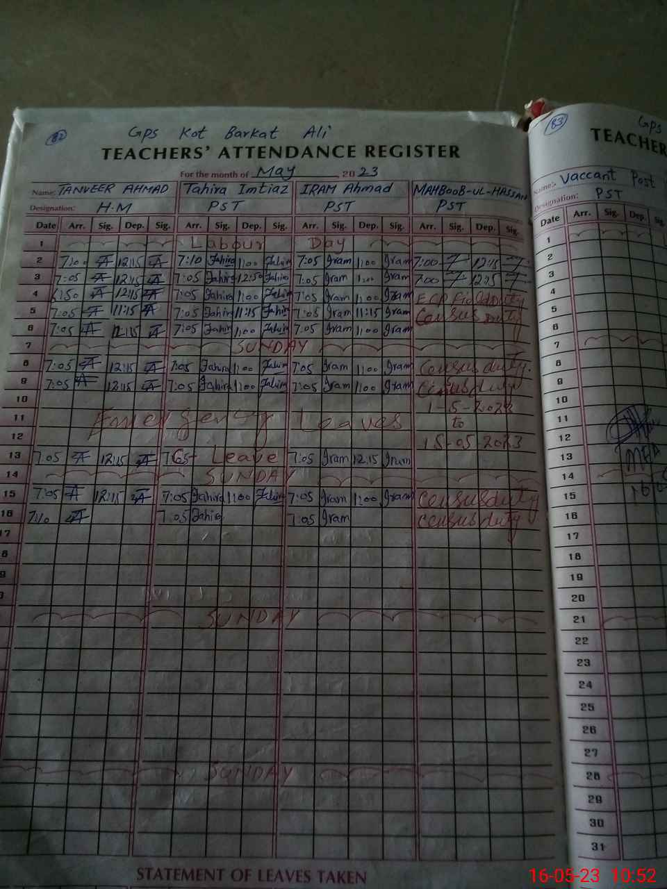 | Leave | Duty | Absent | Maternity | Medical | Ex- Pak |