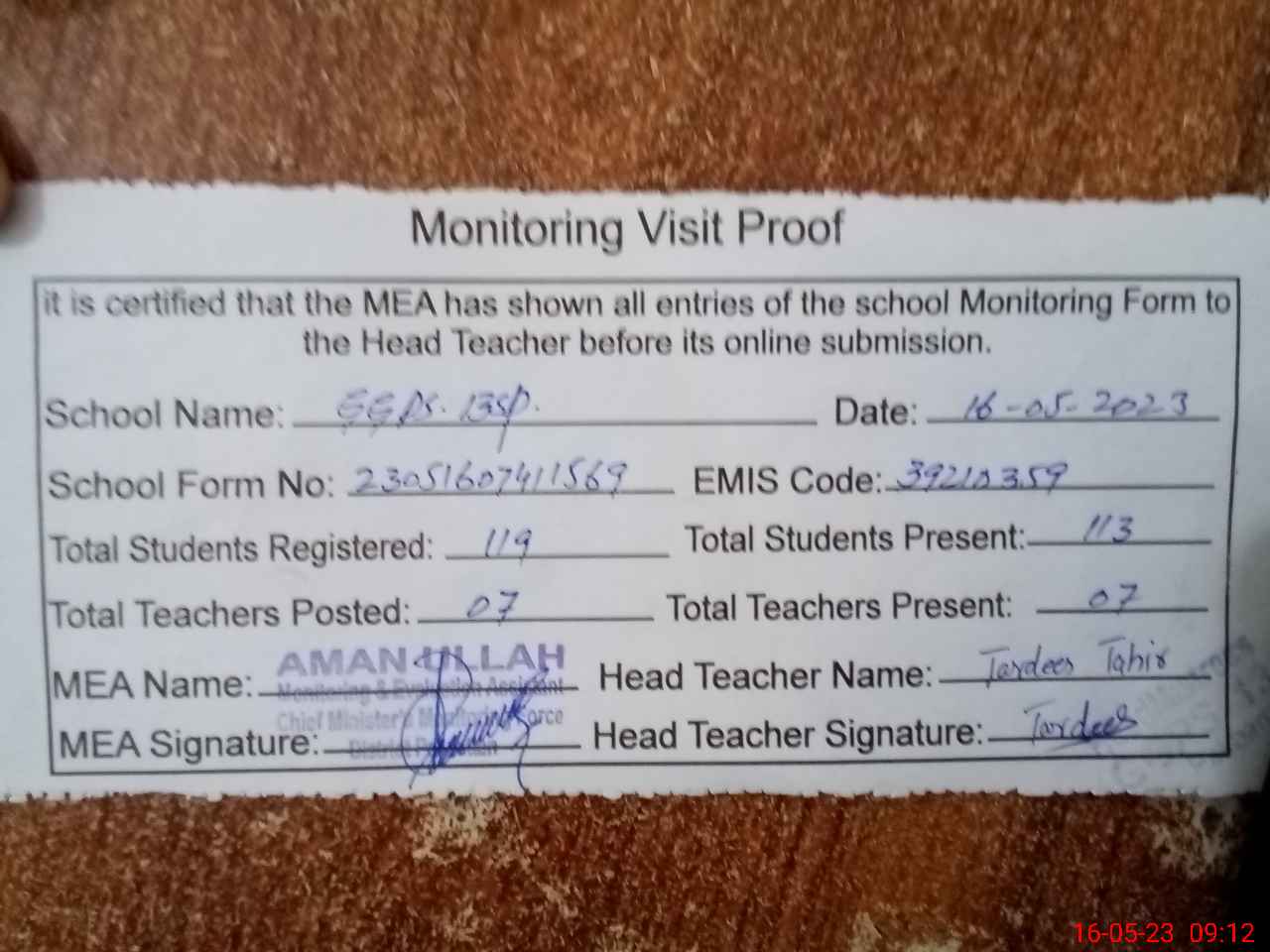 | Attendance Register | Head Teacher | MEA with School | Visit Proof |