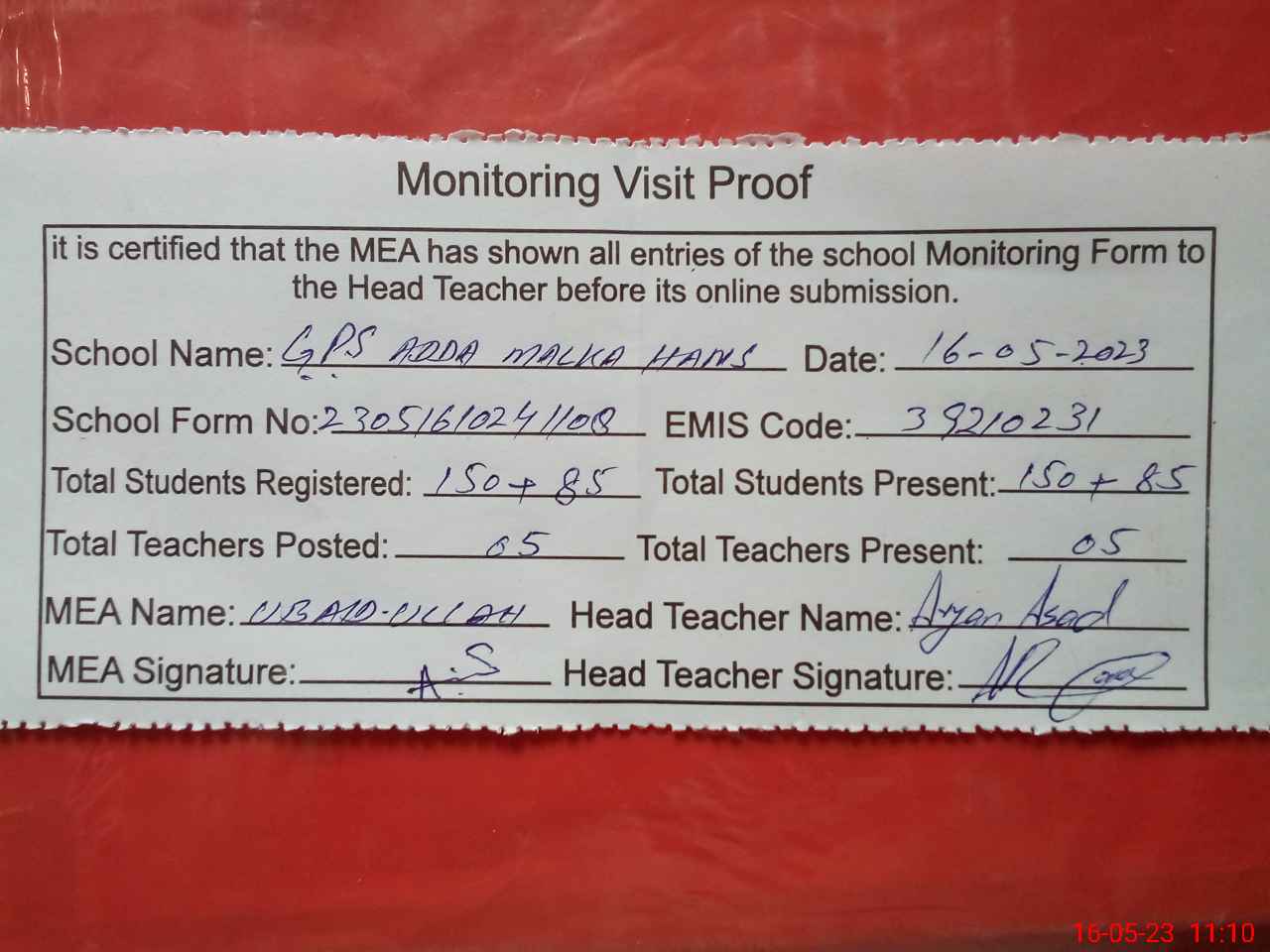 | EMIS Code: 39210231 | Name of School: GPS ADDA MALKA HANS | |||