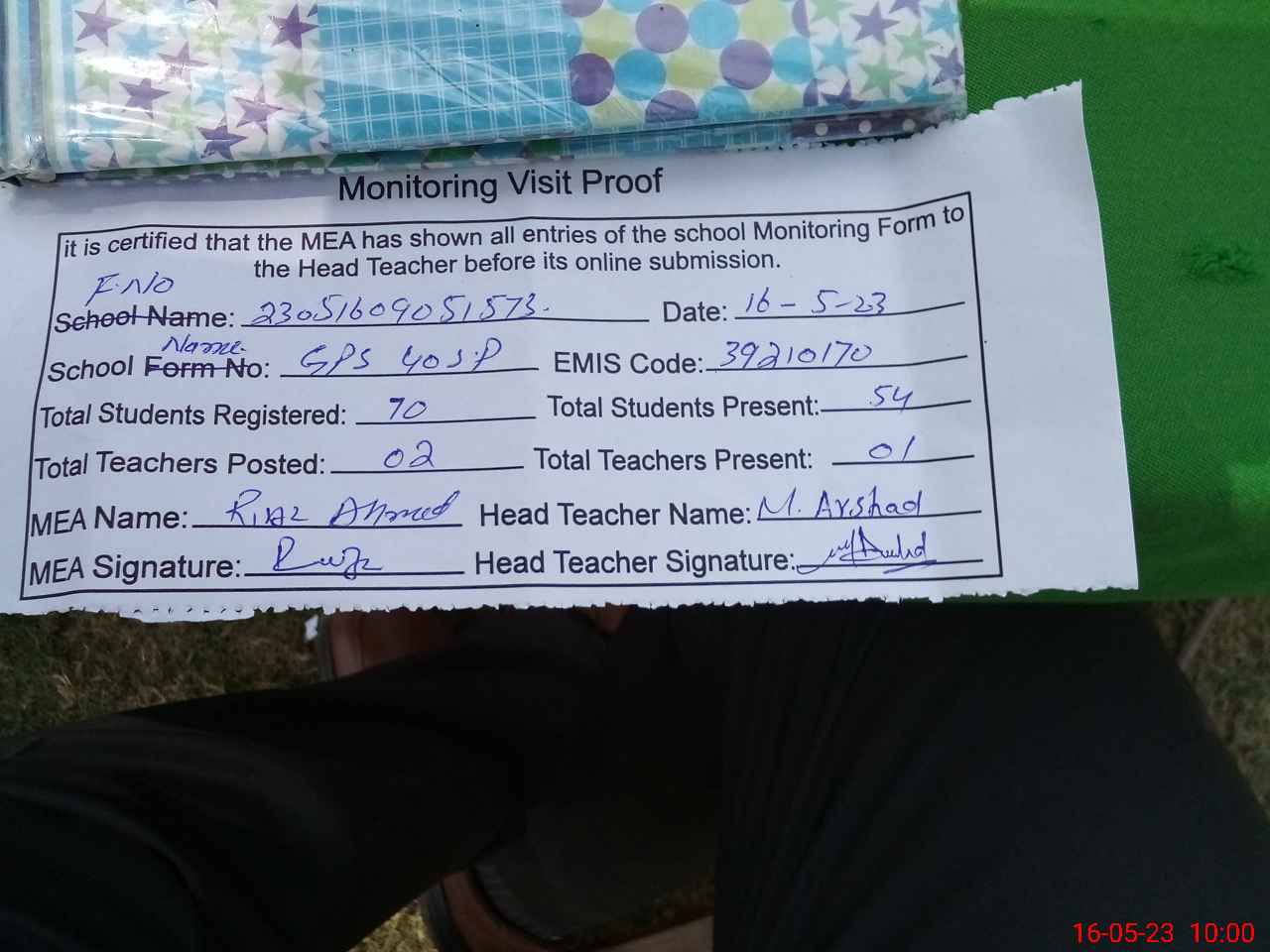 | Attendance Register | Head Teacher | MEA with School | Visit Proof |