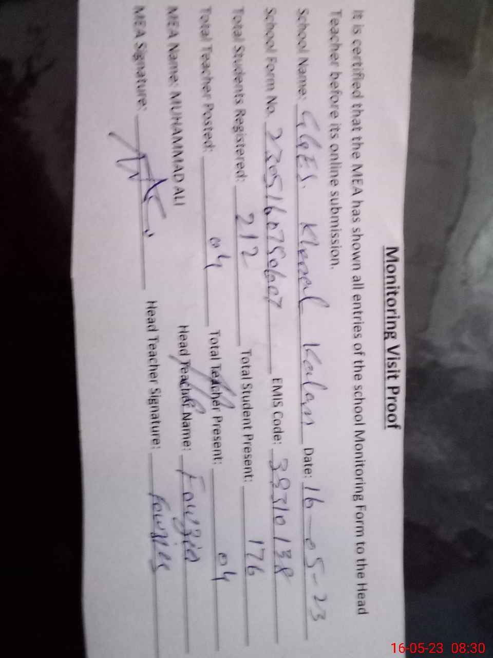 | Attendance Register | Head Teacher | MEA with School | Visit Proof |