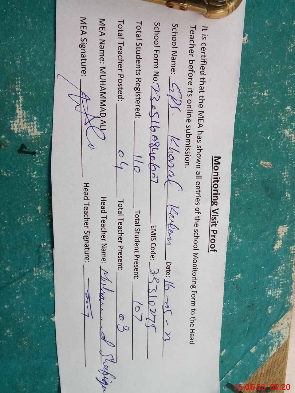 | Attendance Register | Head Teacher | MEA with School | Visit Proof |