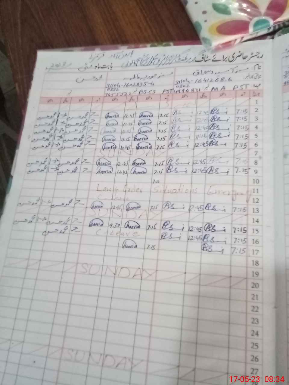 | CNIC | Full Name | Designation | R/C | Absence During Last Calender Month |