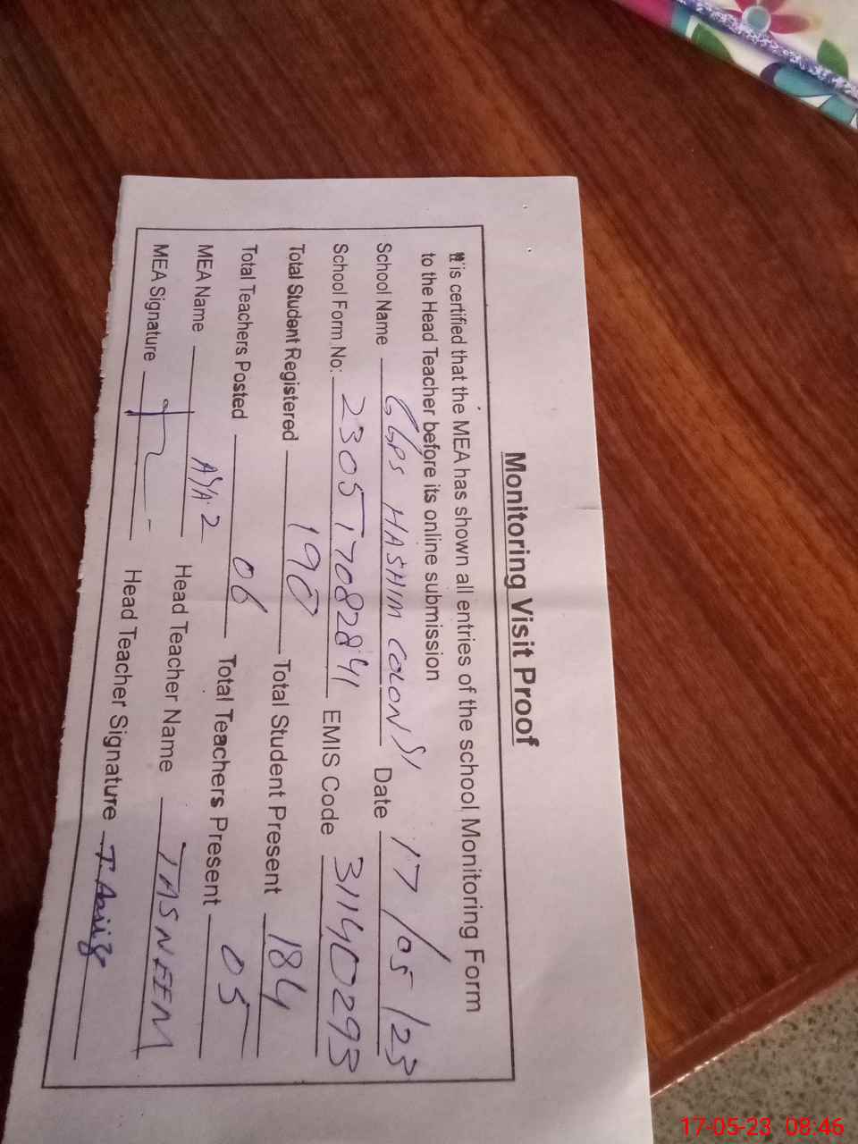 | Attendance Register | Head Teacher | MEA with School | Visit Proof |