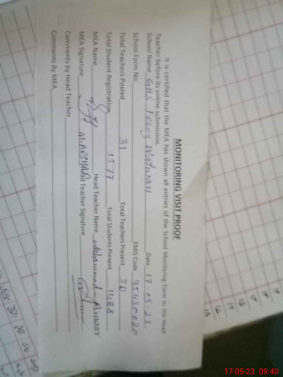 | Attendance Register | Head Teacher | MEA with School | Visit Proof |