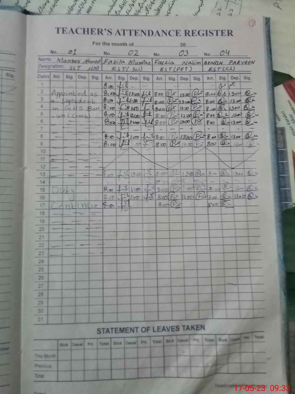 | 37**** | Ma**** Ah**** Ab**** | SST | Regular | 0 | 0 | 0 | 0 | 0 | 0 | 0 | 0 | 0 | Exam Duty |