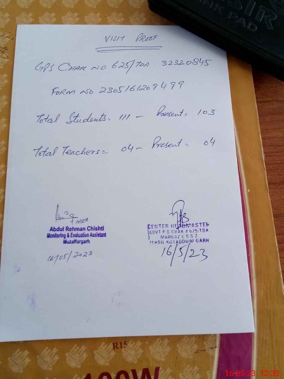 | Attendance Register | Head Teacher | MEA with School | Visit Proof |