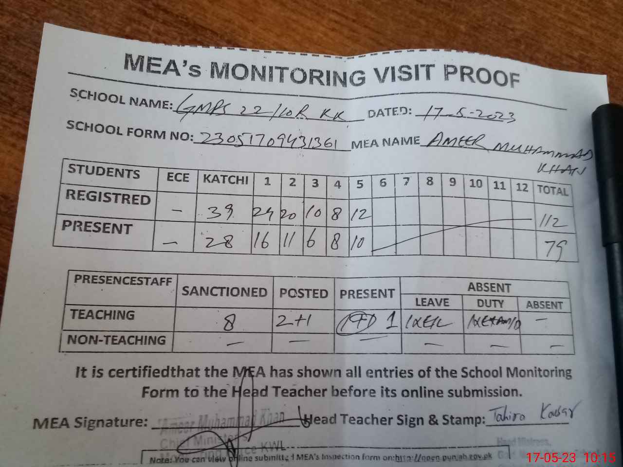 | Attendance Register | Head Teacher | MEA with School | Visit Proof |