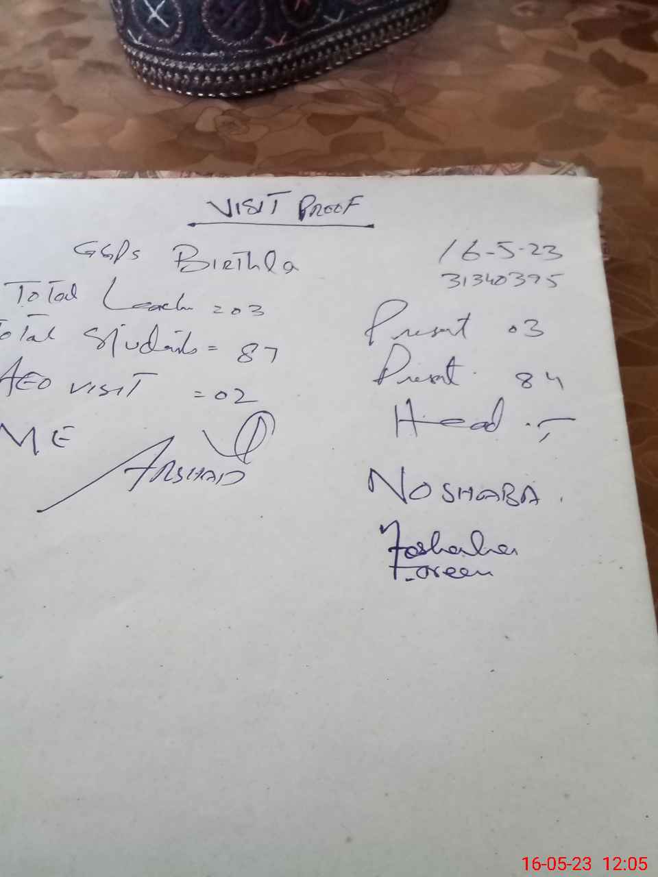 | Attendance Register | Head Teacher | MEA with School | Visit Proof |