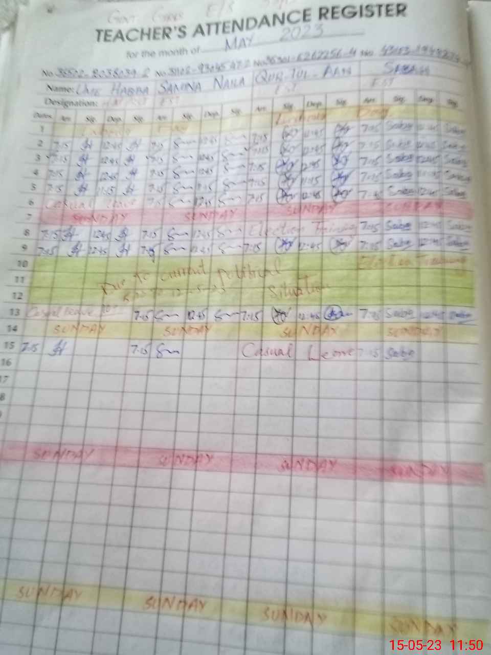 | Name: UM**** HA**** Designation: (School Headmaster's/Headmistress's) SST Sci Phone/Cell Number: 03**** |