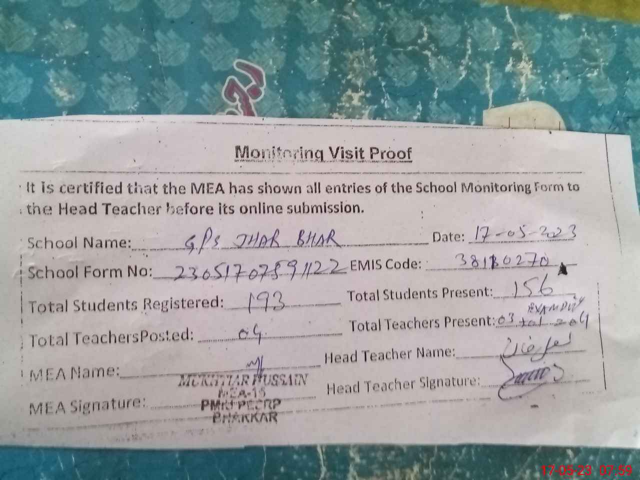 | Attendance Register | Head Teacher | MEA with School | Visit Proof |