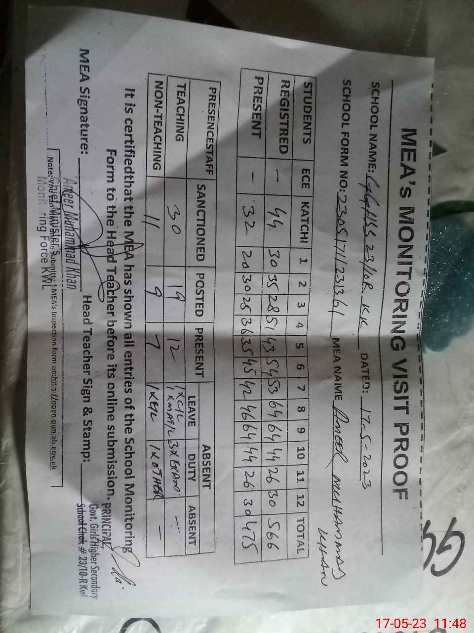 | EMIS Code: 36420050 | Name of School: GGHSS 23/10-R, KACHA KHUH | |||