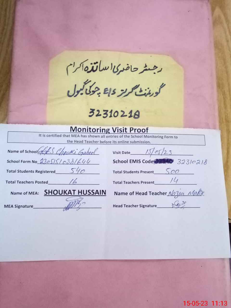 | EMIS Code: 32310218 | Name of School: GGES CHOWKI GABOOL | |||