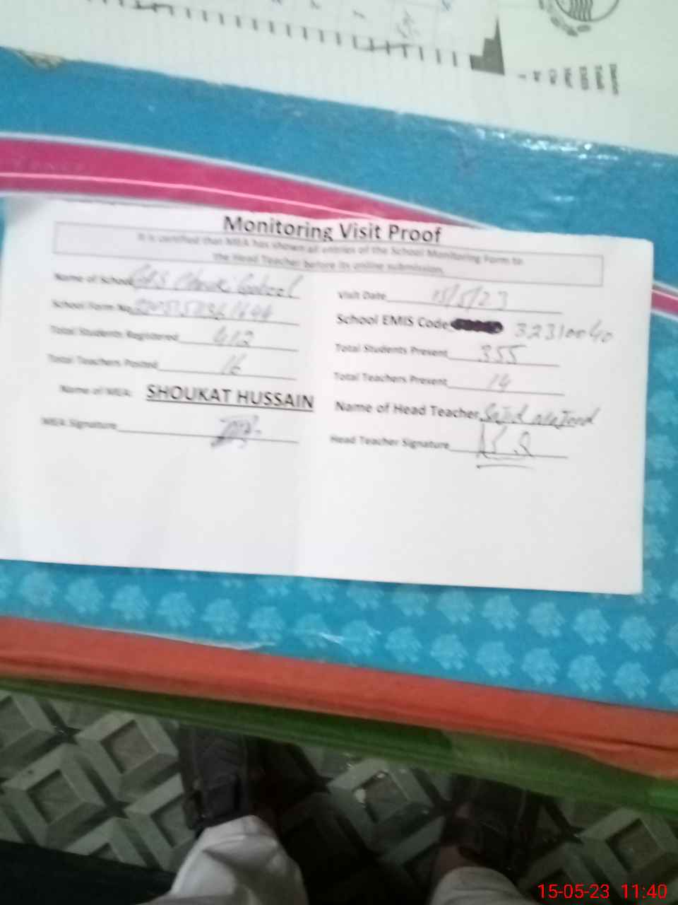 | Attendance Register | Head Teacher | MEA with School | Visit Proof |