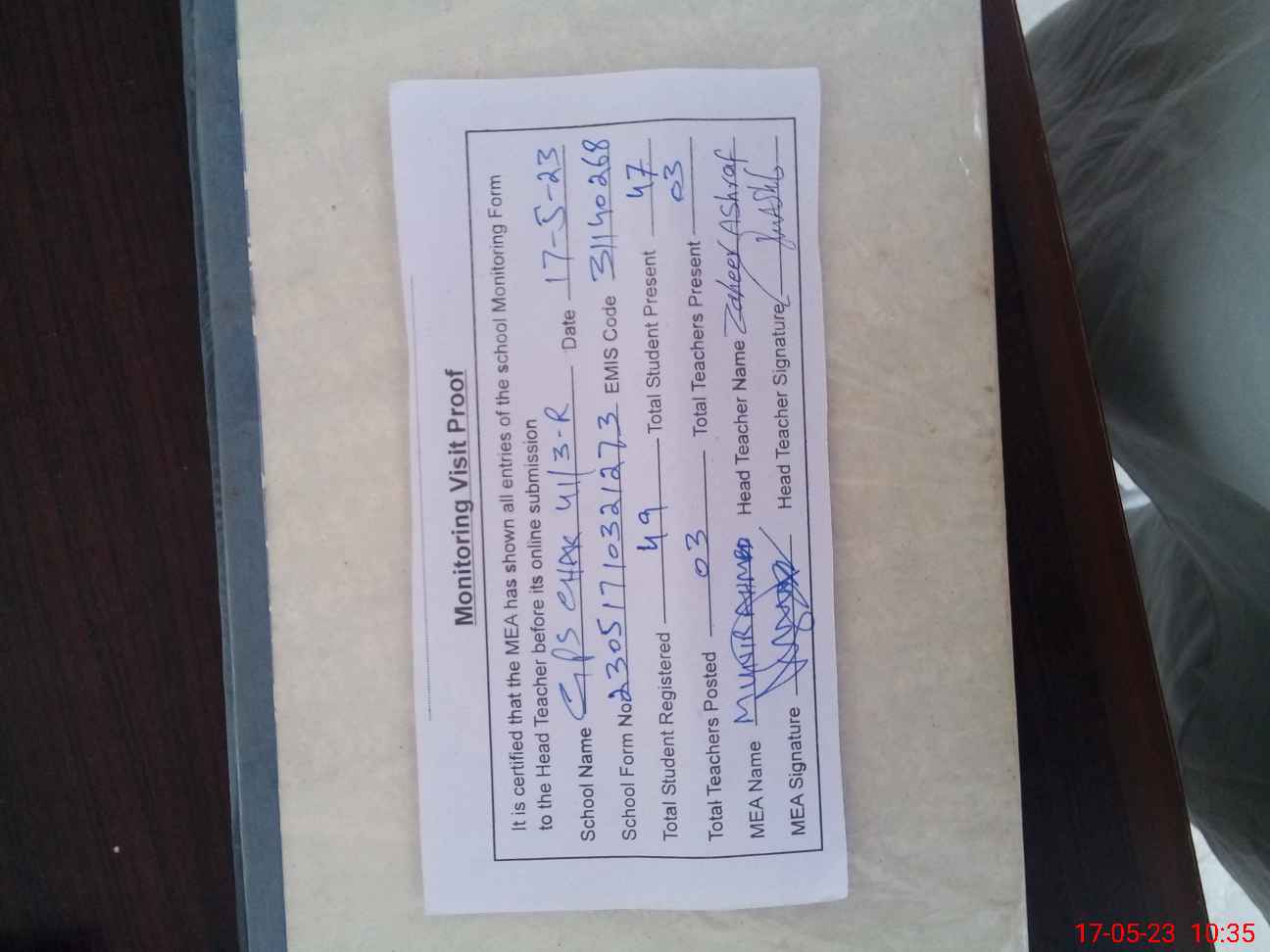 | Attendance Register | Head Teacher | MEA with School | Visit Proof |