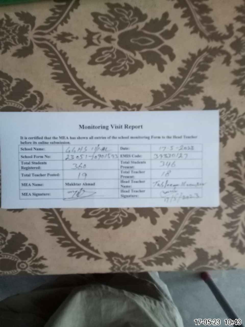 | Certified that this School was Inspected by the Undersigned MEA/DMO Today and the Information Stated Above is as Per Record. | |||||