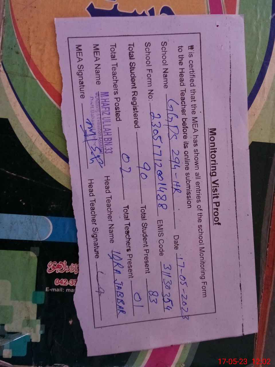 | Attendance Register | Head Teacher | MEA with School | Visit Proof |