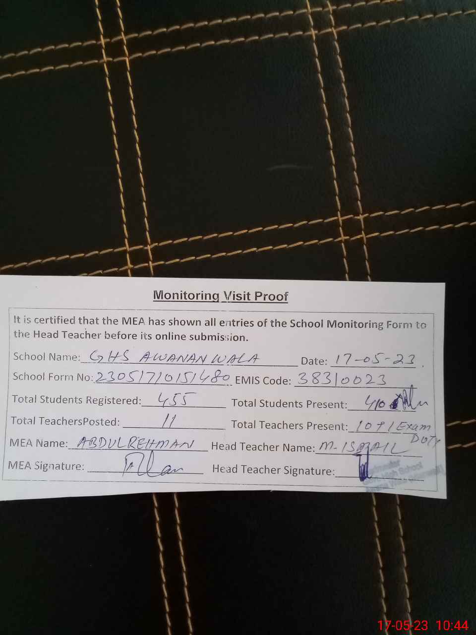 | Attendance Register | Head Teacher | MEA with School | Visit Proof |
