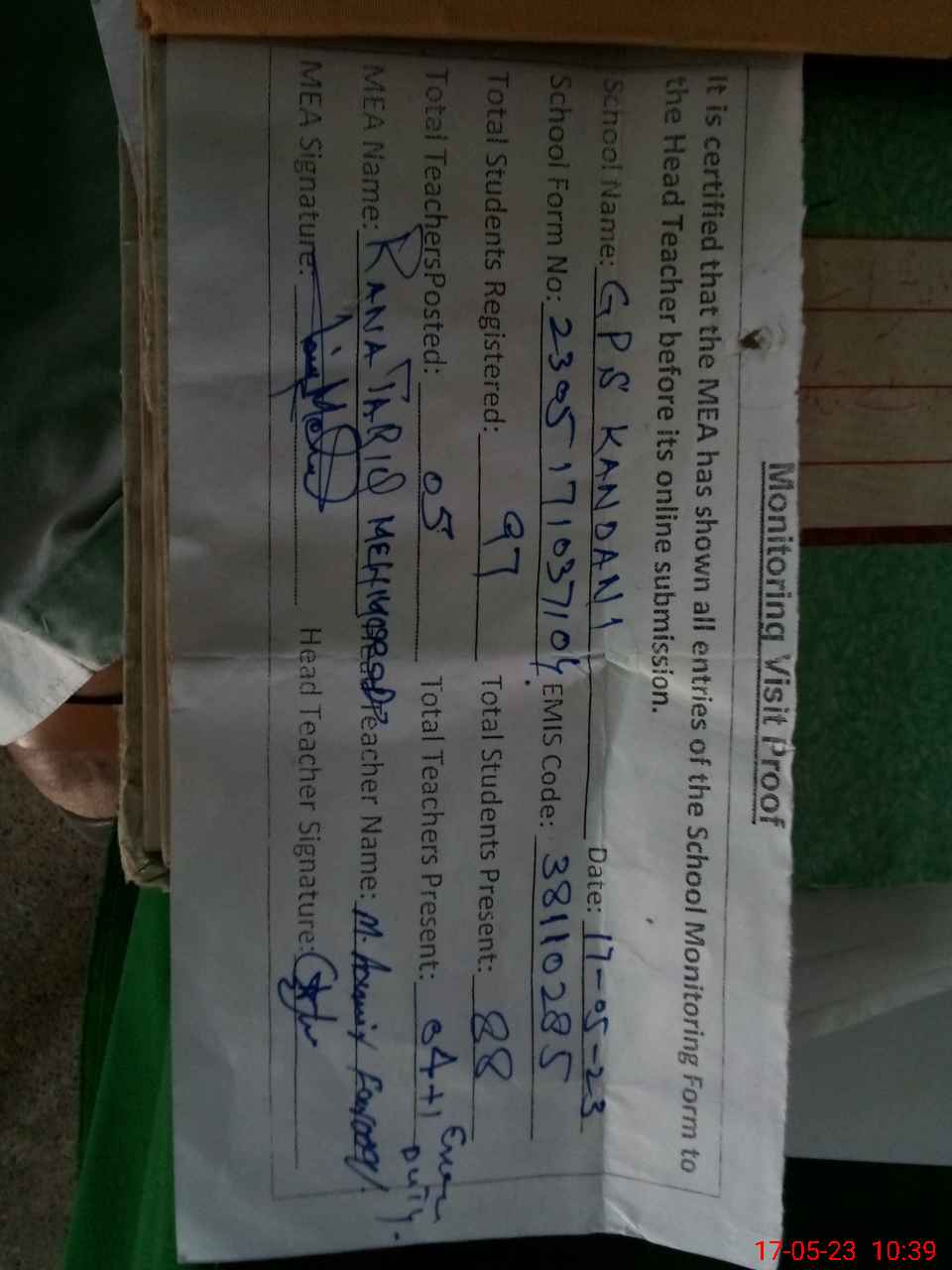 | Attendance Register | Head Teacher | MEA with School | Visit Proof |