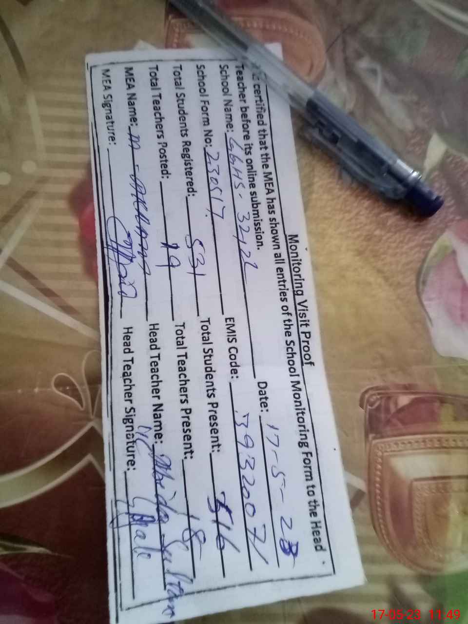 | Attendance Register | Head Teacher | MEA with School | Visit Proof |
