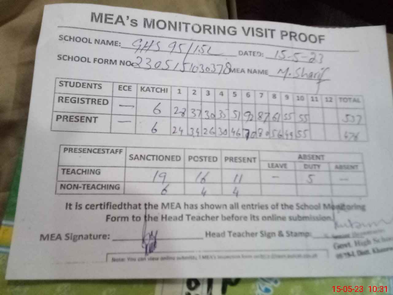 | Attendance Register | Head Teacher | MEA with School | Visit Proof |