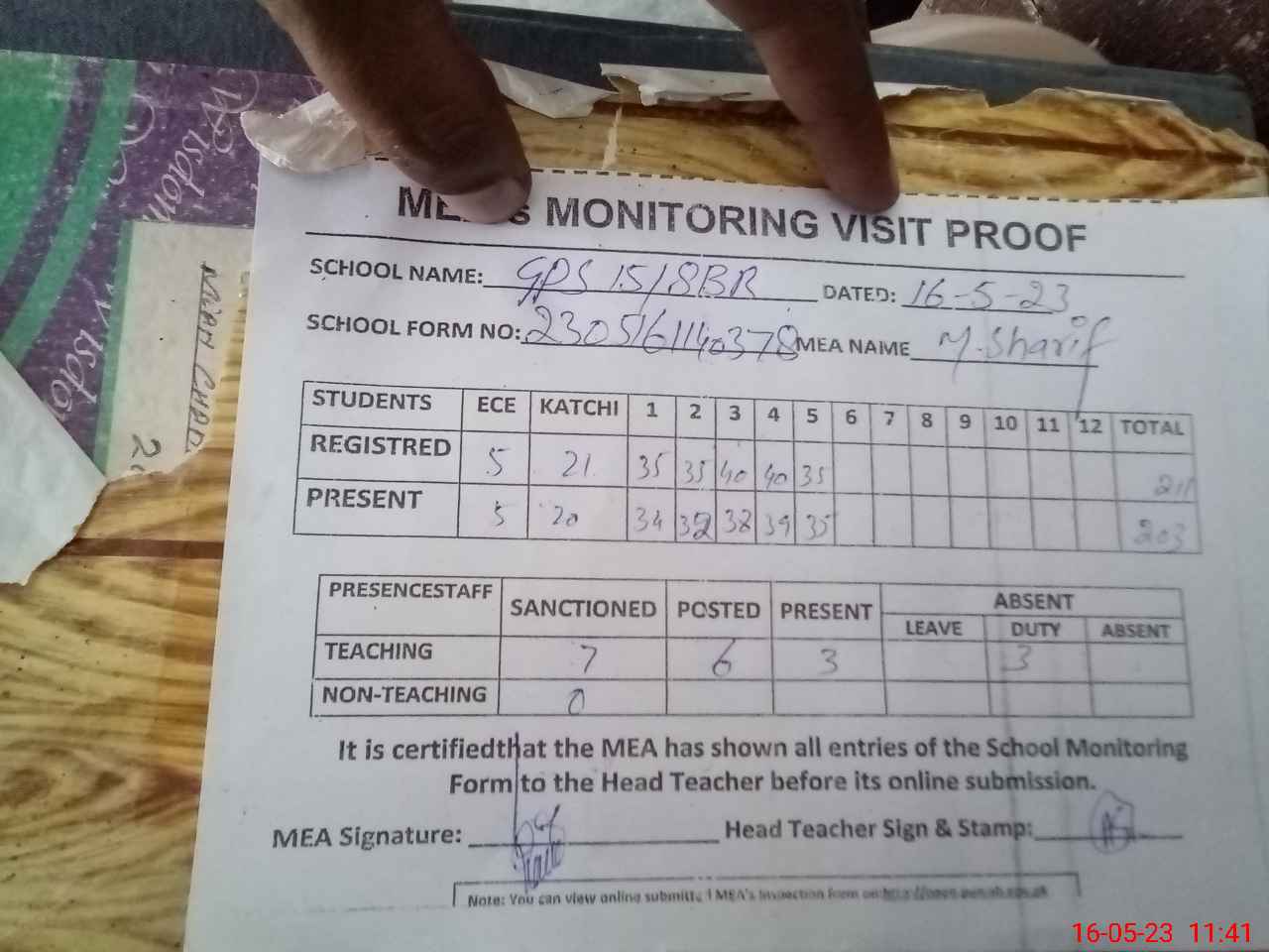 | Attendance Register | Head Teacher | MEA with School | Visit Proof |