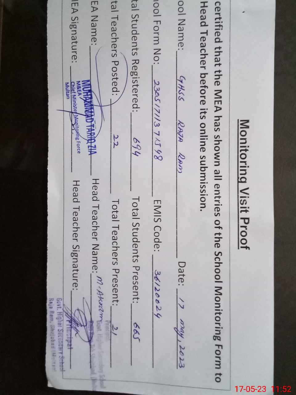 | Attendance Register | Head Teacher | MEA with School | Visit Proof |