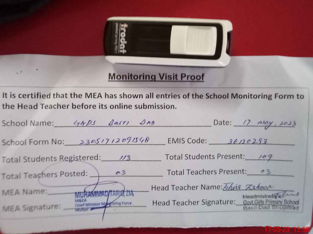 | EMIS Code: 36120293 | Name of School: GGPS BASTI DAD SHUJABAD MULTAN | |||