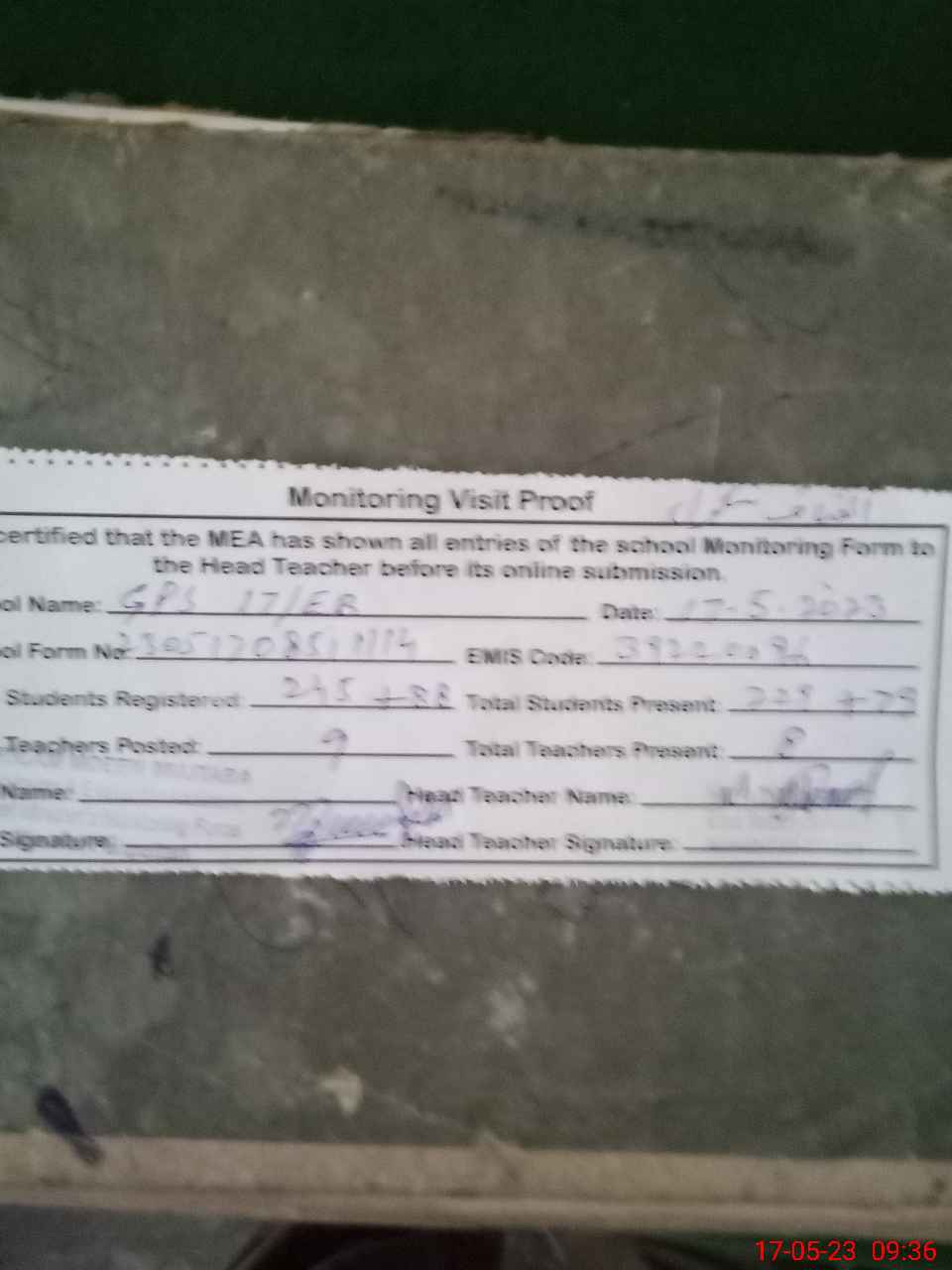 | Monitoring Date: 17-05-2023 | Start Time: 17-05-2023 08:51 AM | End Time: 17-05-2023 09:36 AM | Name of MEA: Gh**** Mu**** Mu**** (R**** | |