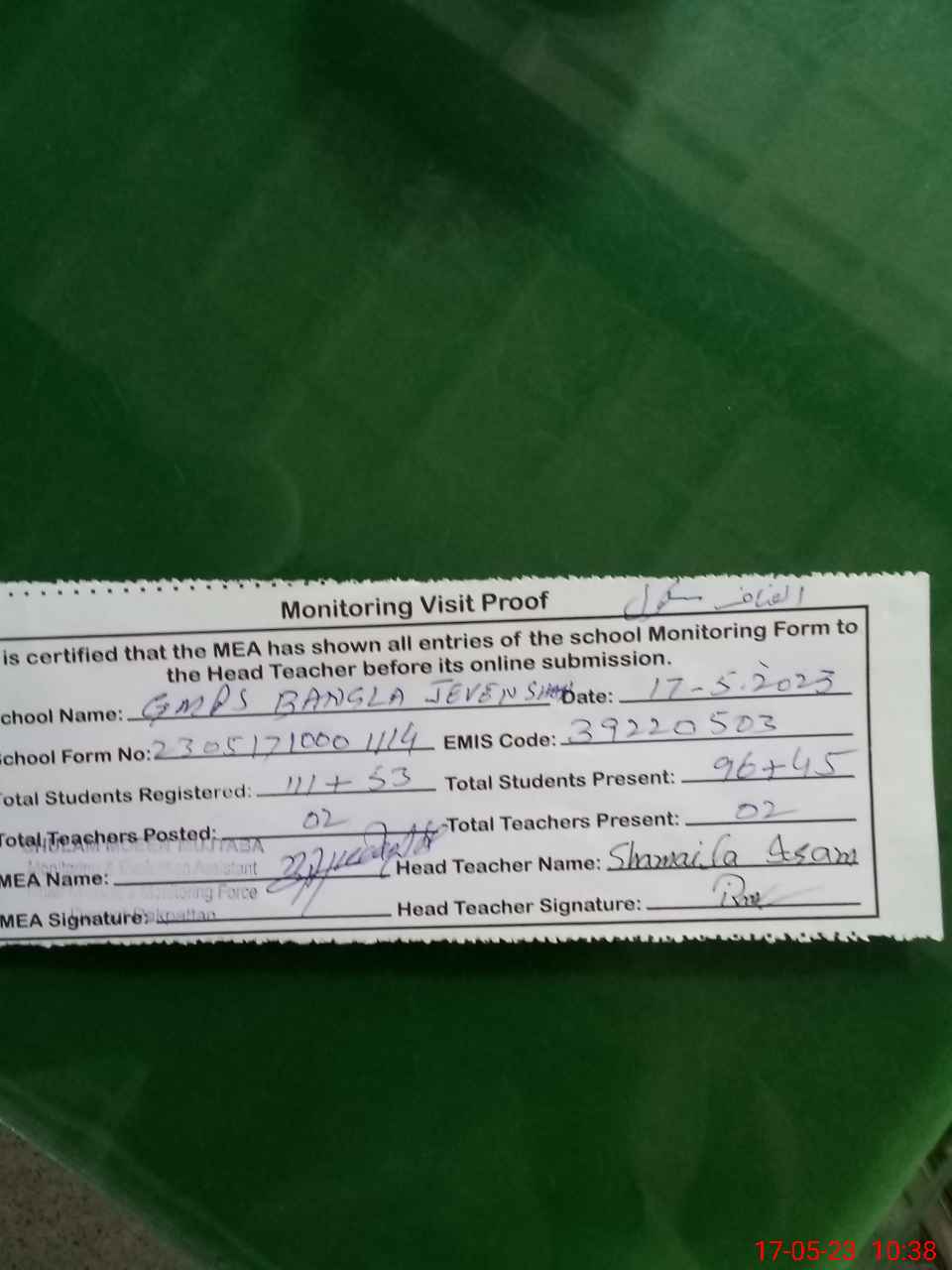 | Monitoring Date: 17-05-2023 | Start Time: 17-05-2023 10:00 AM | End Time: 17-05-2023 10:38 AM | Name of MEA: Gh**** Mu**** Mu**** (R**** | |